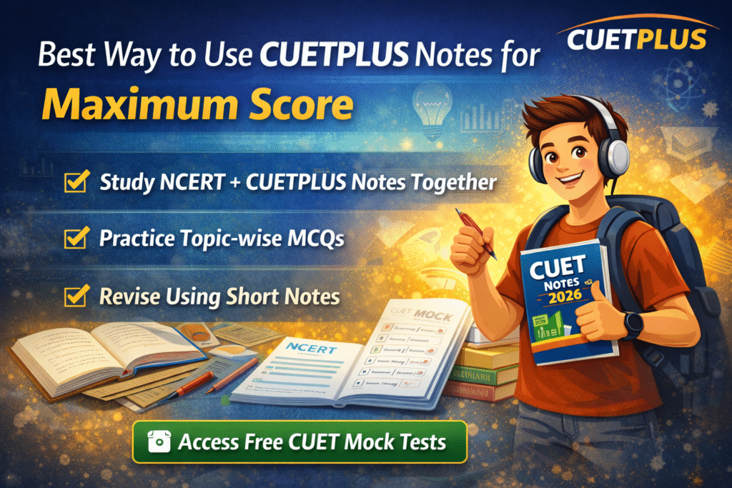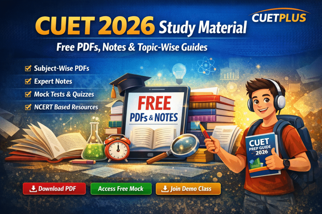 CUETPLUS provides students with free PDFs of CUET notes, subject-wise study guides, and other expert created resources, which are fully aligned with the latest CUET syllabus. These notes were created to support preparation for both board exams and CUET MCQ practice, while ensuring complete conceptual understanding without justification overload. Download CUET study material 2026 — subject-wise PDFs, notes, and topic-wise exam prep resources